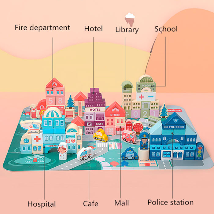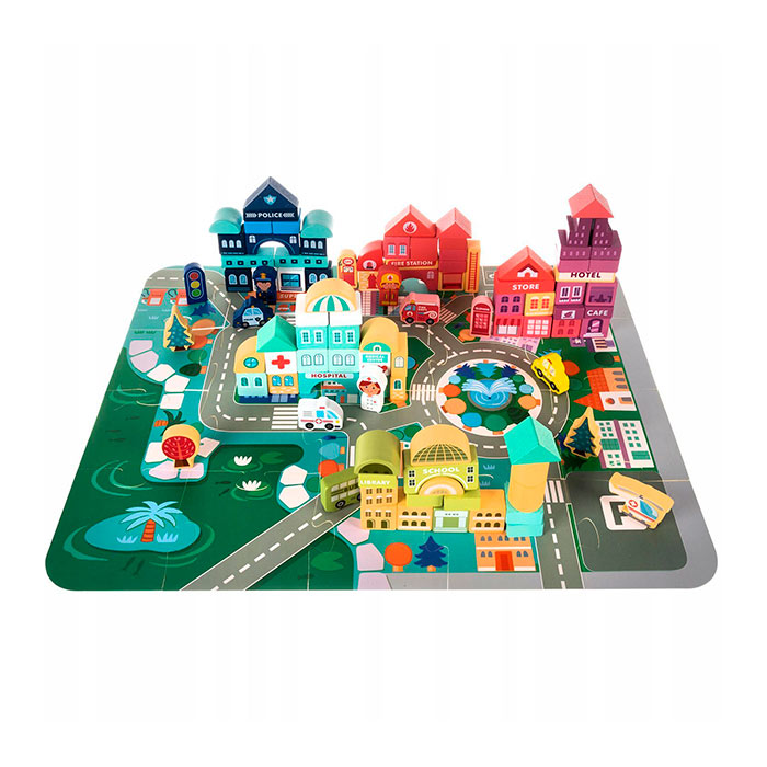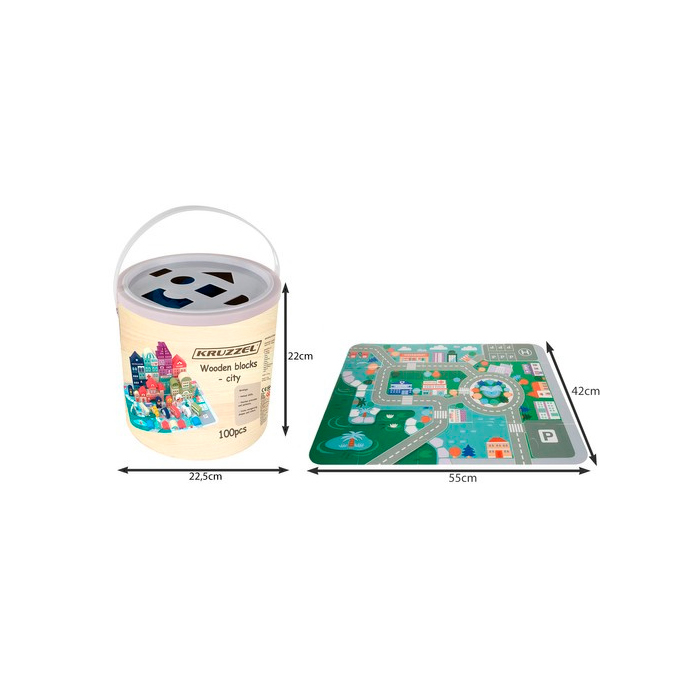 Táto bohatá sada obsahuje 100-dielnu sadu klasických kociek rôznych tvarov s číslami a písmenami, kocky zobrazujúce domy, vozidlá, stromy, ľudské figúrky, veko na triedenie, praktické úložné vedro a puzzle hraciu podložku!