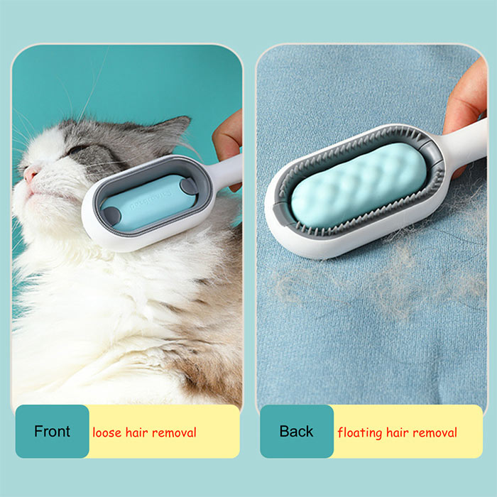 Predná časť kefy sa používa na česanie srsti zvieraťa, zatiaľ čo zadná časť sa používa na odstraňovanie chlpov z textílií alebo nábytku. Časť zo silikónu je tiež určená na masáž. Ak odstránite časť zo silikónu, môžete k nej pripojiť handru/kefu na česanie vášho zvieraťa. Časť zo silikónu má tiež otvor, do ktorého môžete nalejte vodu/šampón atď.