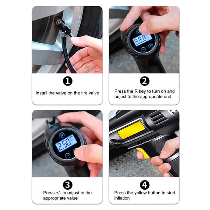 Jednoducho zapojte kábel do auta, stlačte tlačidlo a nechajte zariadenie robiť svoju prácu. Keď sú pneumatiky nahustené, uvoľnite tlačidlo. Na digitálnom displeji sa zobrazí tlak v pneumatikách.